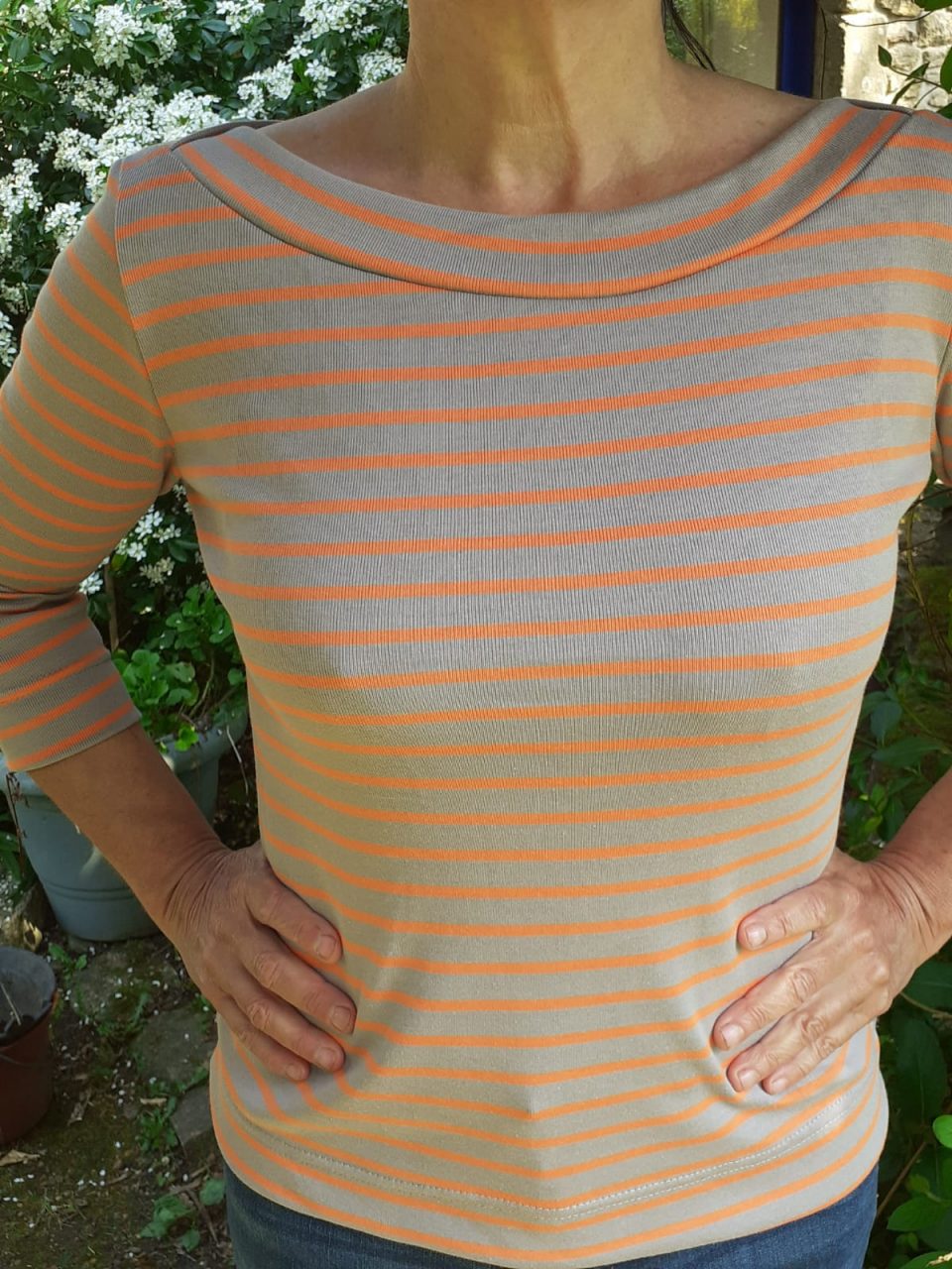 Marinière Femme Gris/Orange Col Croisé Coton Biologique Cote 1×1 320g/m²